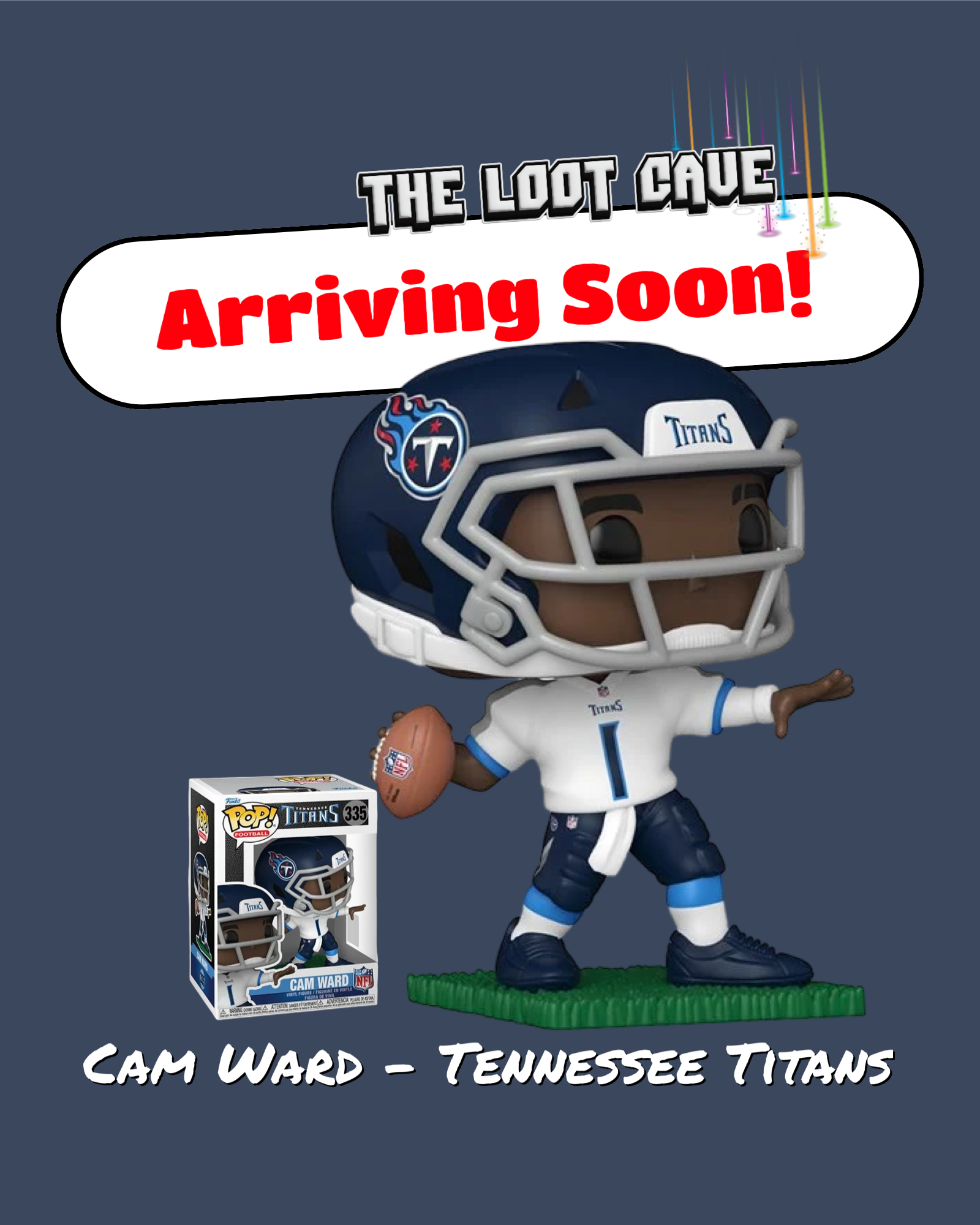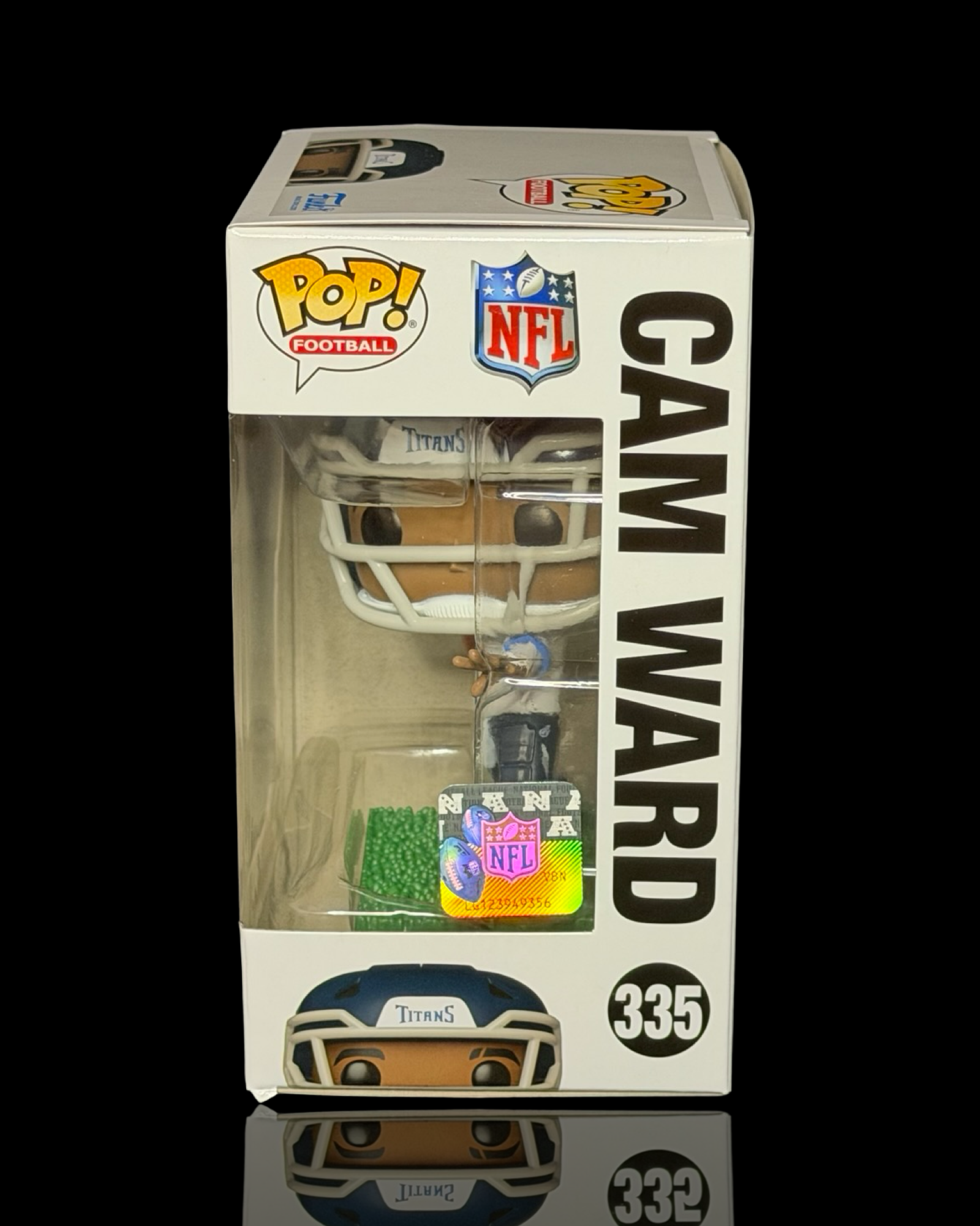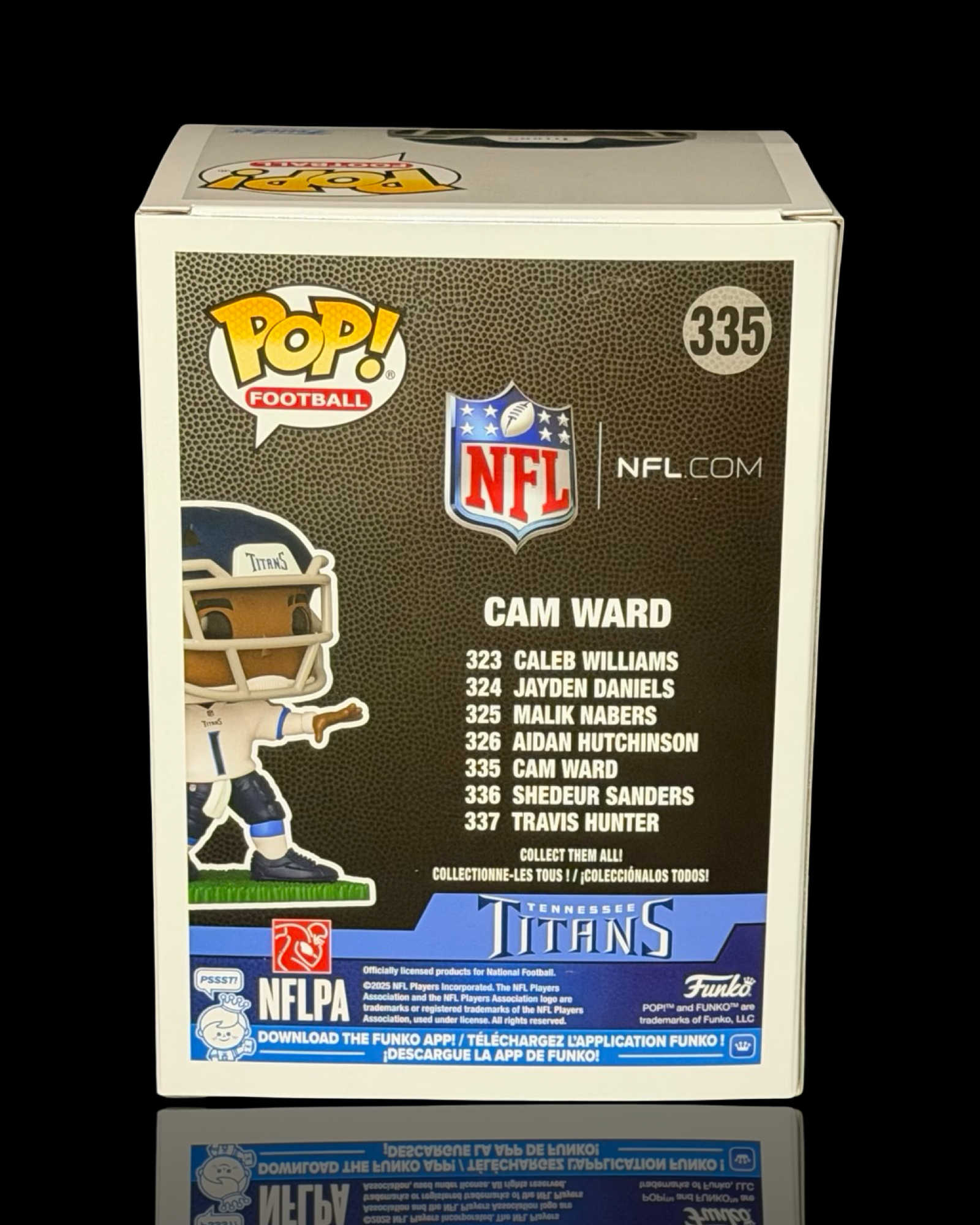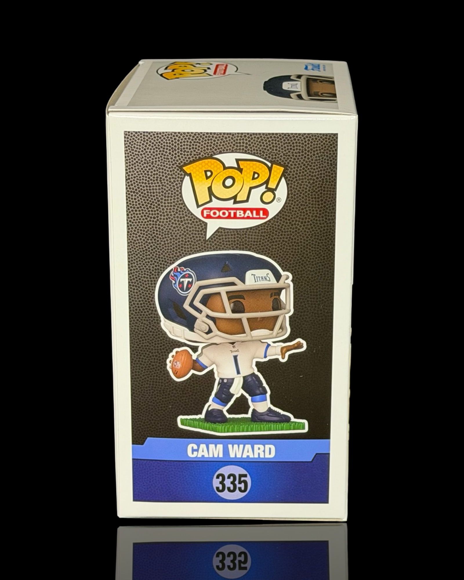 Cam Ward, quarterback for the Tennessee Titans, to your NFL Funko Pop! collection featuring his white and navy uniform! Which team will Cam Ward and the Titans play next in your football set? This NFL Titans Cam Ward Funko Pop! Vinyl Figure #335 measures approximately 44-inches tall and comes packaged in a window display box. For ages 3 and up.
